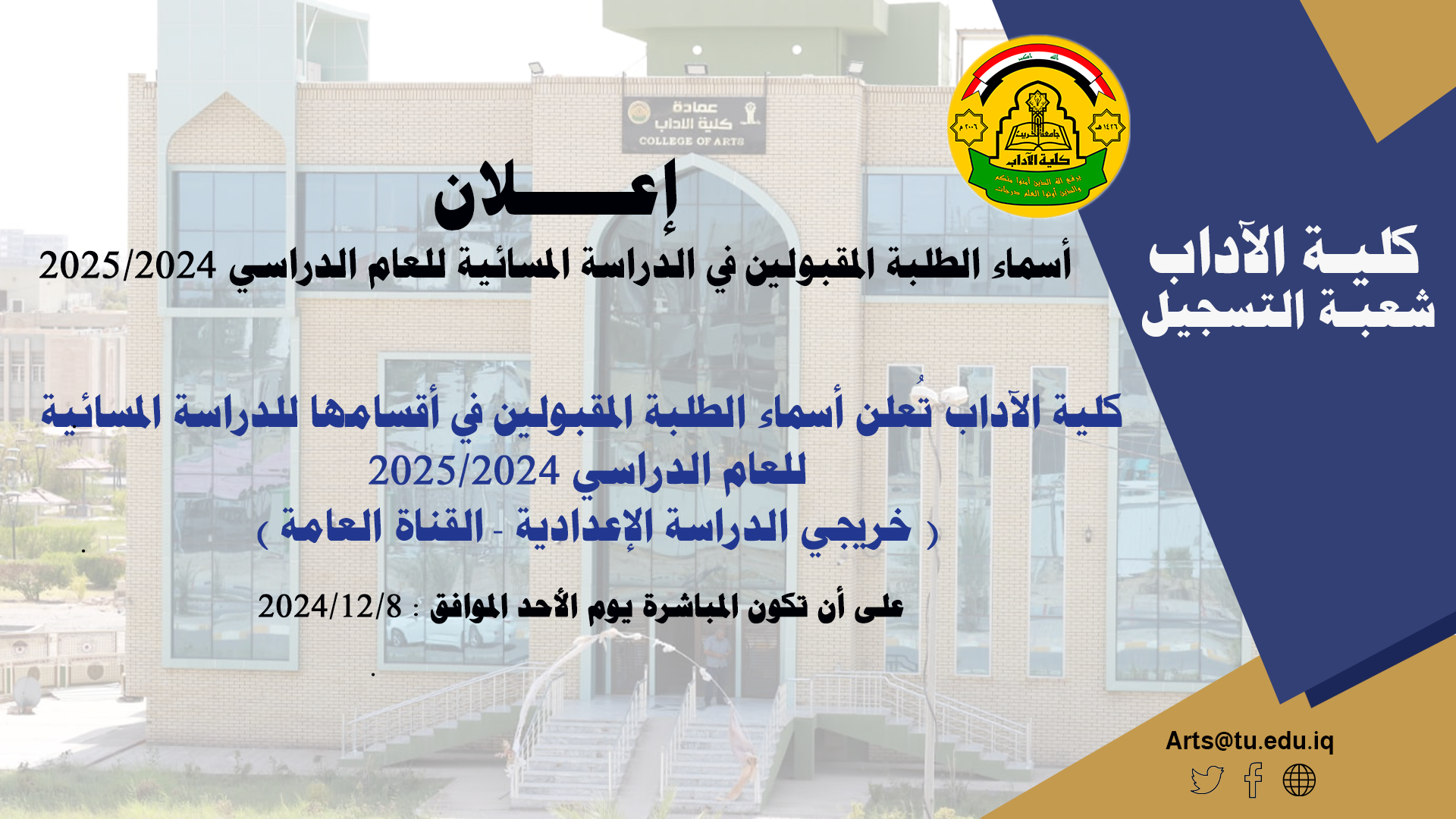 كلية الآداب تُعلن أسماء الطلبة المقبولين في أقسامها للدراسة المسائية 2025/2024 للعام الدراسي ( خريجي الدراسة الإعدادية - القناة العامة ) على أن تكون المباشرة يوم الأحد الموافق : 2024/12/8 .
