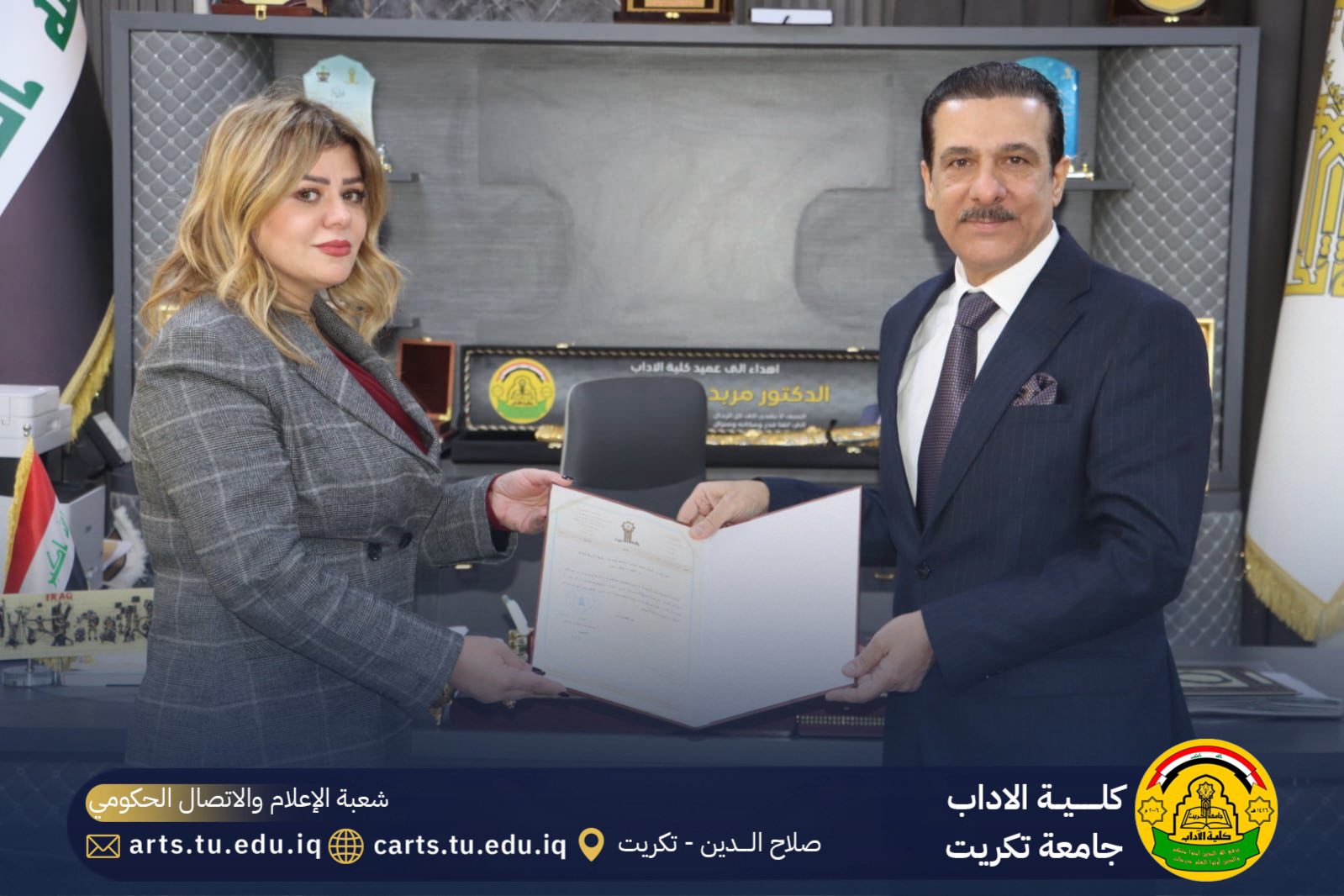 وقد حضر المناقشة السيد مساعد رئيس جامعة تكريت الاستاذ الدكتور حسن حسين ابراهيم و السيد عميد كلية الاداب الاستاذ الدكتور مربد صالح ضامن وعدد من تدريسيي الكلية وطلبتها.
