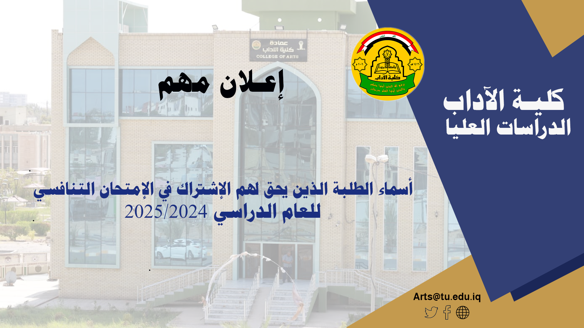 الى جميع الطلبة المقبولين في كلية الآداب للعام الدراسي 2023/2024 ممن لم يقوموا بجلب و ثيقة الصف السادس الاعدادي الاصلية ، عليهم جلب و ثيقتهم الاصلية وبموعد اقصاه 1/4/2024 و خلاف ذلك يعتبر قبولهم ملغياً في كلية اللآداب .