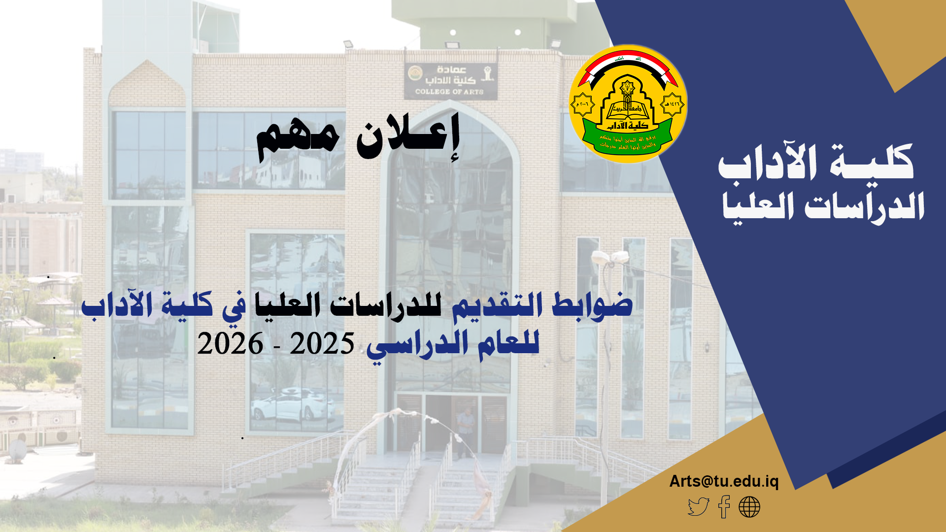 ضوابط التقديم للدراسات العليا في كلية الآداب للعام الدراسي ٢٠٢٥ / ٢٠٢٦ .