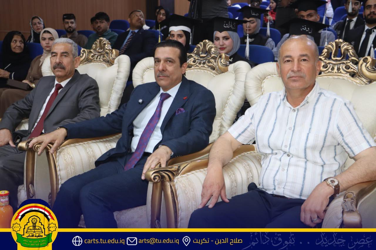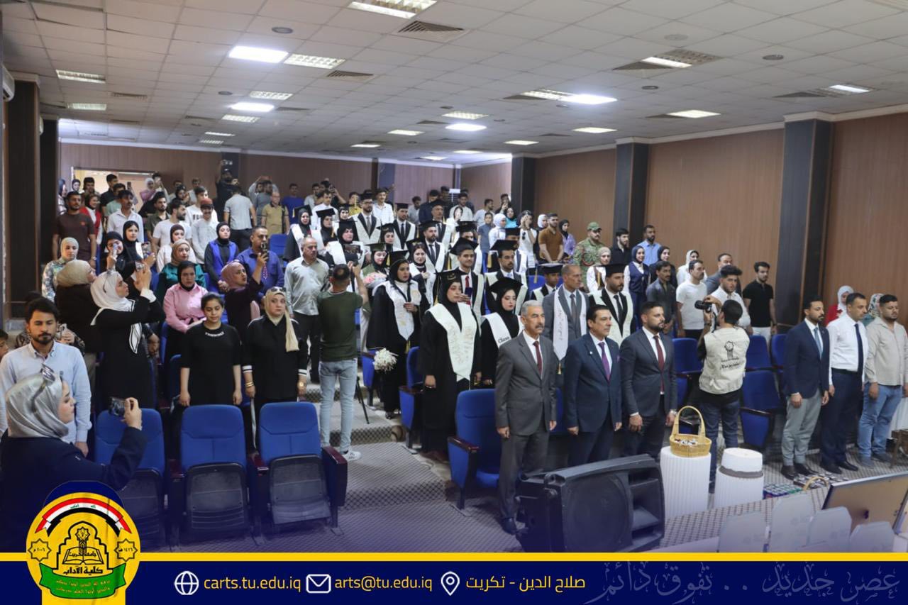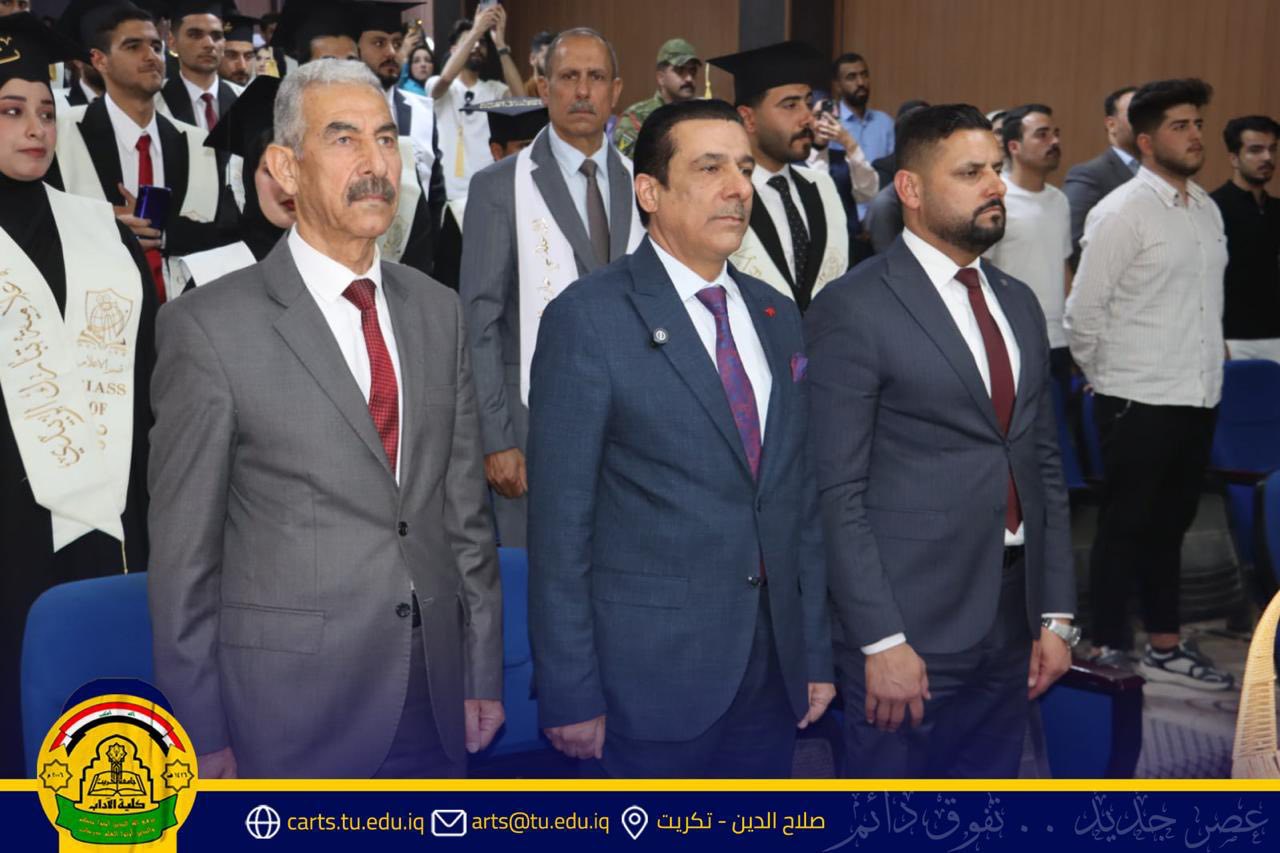 واستُهِلَّ الحفل بعزف النشيد الوطني، ثم ألقى عميد كلية الآداب، الأستاذ الدكتور مربد صالح ضامن، كلمة هنّأ فيها الخريجين وأشاد بجهودهم خلال سنوات الدراسة، متمنيًا لهم مستقبلاً مشرقًا وحافلًا بالعطاء في ميادين العمل والمعرفة